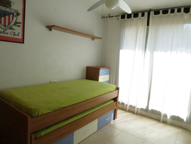 Living (canapé-lit une personne) donnant sur grande terrasse meublée.